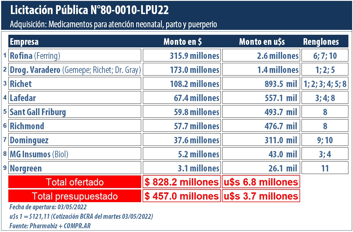 Para el proceso, que fue solicitado por la Dirección Nacional de Salud Perinatal y Niñez que tiene al frente a Gabriela Bauer, se destinó un presupuesto inicial estimado de $457 millones (u$s 3.7 millones). La licitación está conformada por un conjunto de 11 renglones, entre los que figuran drogas uterinas; antianémicos; inductores del parto; antiasmáticos; antihipertensivos; y reguladores hormonales.