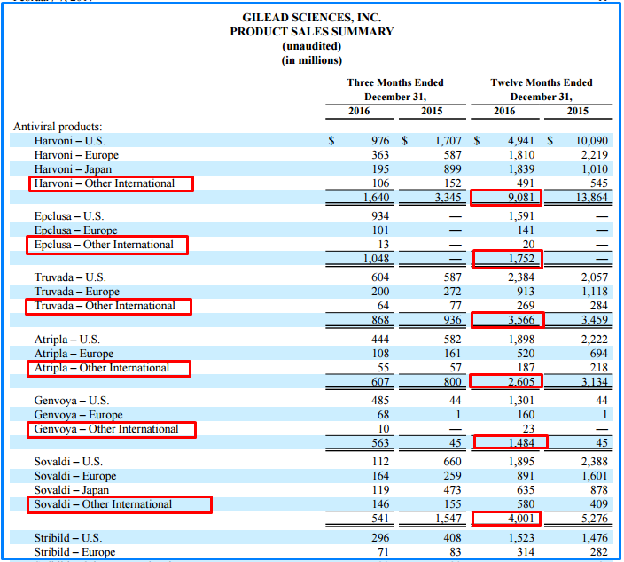 La norteamericana Gilead tuvo en el 2016 a su producto para Hepatitis, Harvoni como punta de lanza. Sin embargo, a pesar de ser la superstrella de la temporada, las ventas de la compañía declinaron un -7%. Ver Documento.