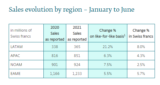 De enero a junio de este año la firma registró, según su reporte de resultados financieros, una facturación de 3.476 millones de francos suizos (u$s 3.787 millones). Así, los ingresos de la firma treparon un 7.9% frente al mismo período del 2020.