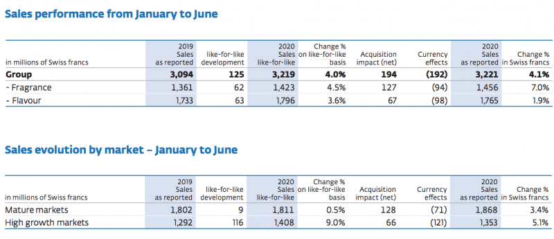 El grupo suizo Givaudan presentó su reporte financiero para los primeros seis meses del 2020, en los que exhibió ventas por 3,221 millones de francos suizos (u$s 3,434 millones). Esto significó un aumento del 4.1% en su moneda local en comparación con el mismo período del año anterior. Ver press release.