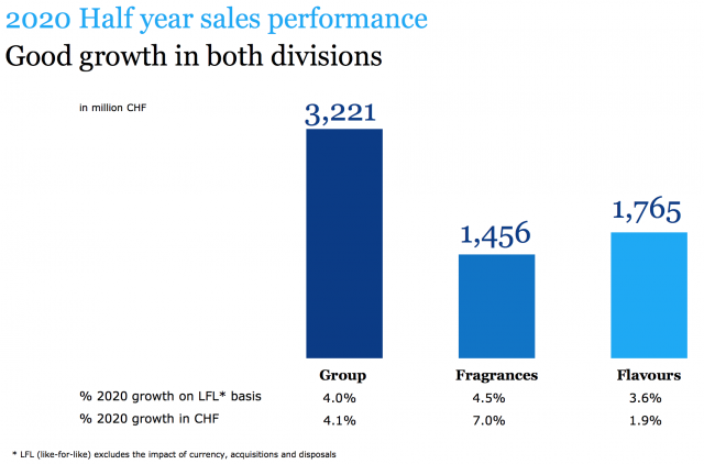 Una vez más, su división de Fragancias fue la que más creció: trepó un 7% en francos suizos. Mientras que el negocio de Flavour avanzó sólo un 1.9% semestre contra semestre, de acuerdo con los resultados informados. Ver artículo.