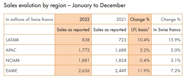 De acuerdo con el documento, la multi registró ventas anuales por 7.100 millones de francos suizos. Esto representa un alza del 5,3% en términos comparables y del 6,5% en moneda local.