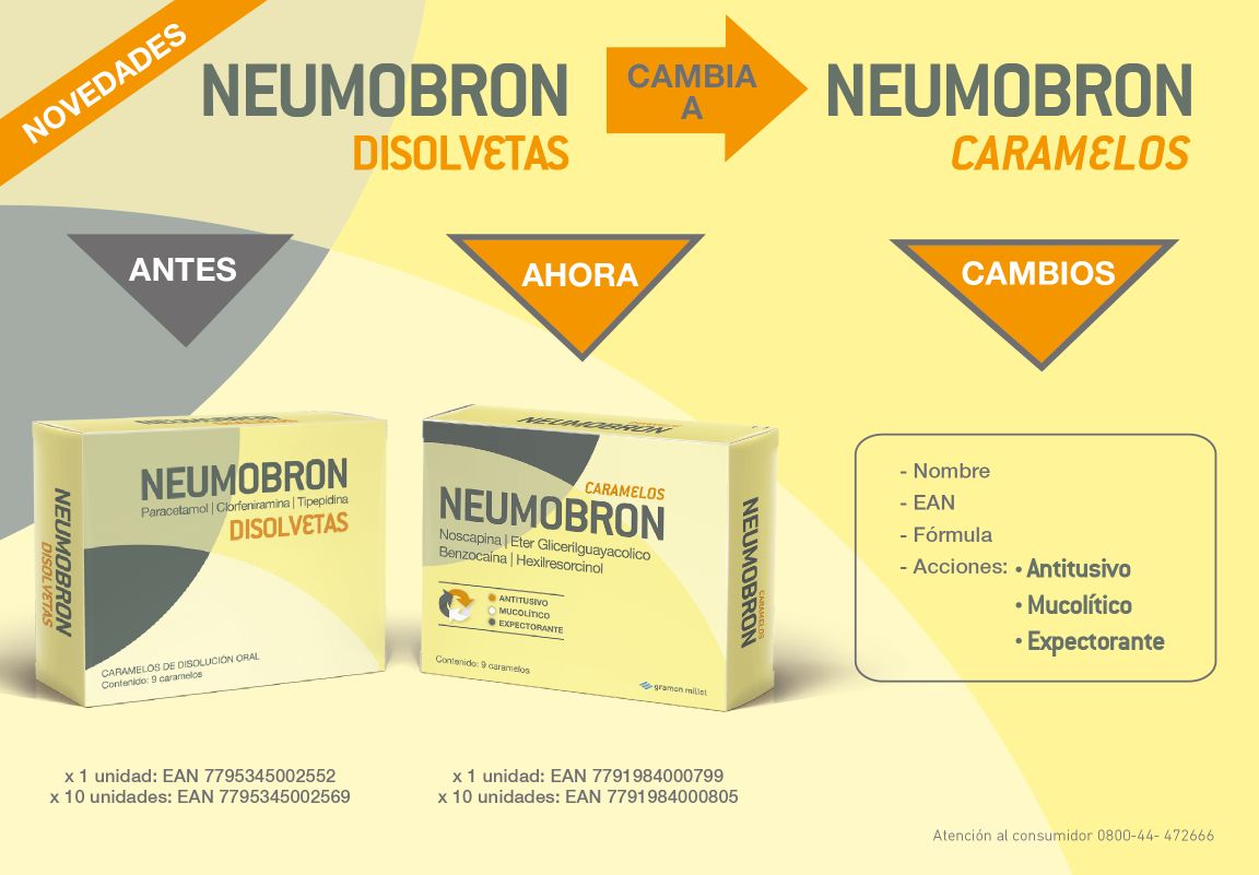 Sin embargo, los cambios no se reducen sólo al nombre. El producto aggiornó su fórmula, que ahora es a base de benzocaína, noscapina y hexilresorcinol; y por tanto también su acción terapéutica. Neumobron Caramelos salió al mercado como antitusivo, mucolítico y expectorante.