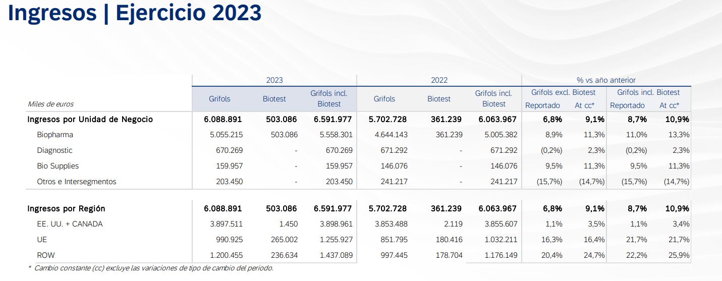 Durante su año fiscal 2023, los ingresos de Grifols se situaron en €6.592 millones, una mejora del 10,9% respecto de su año fiscal 2022. En su nota de resultados, la multi de origen catalán explicó que en su último ejercicio presentó crecimiento en todas las unidades de negocio y regiones clave. Ver Comunicado.