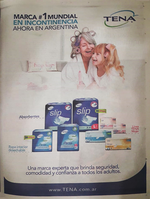 Se trata de Tena, una línea de descartables para adultos con incontinencia urinaria. La empresa define a su marca como la «número 1 mundial en incontinencia», en su aviso publicitario que publicó a página completa en las ediciones dominicales impresas del fin de semana. Ver aviso.