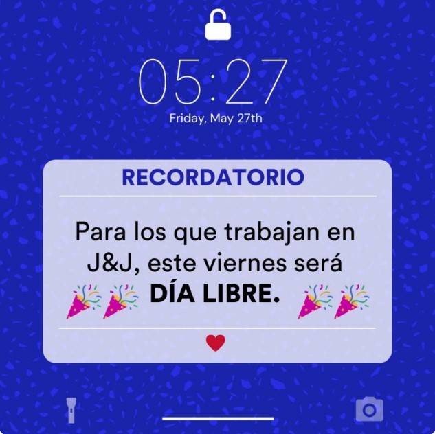 En ese marco, la norteamericana J&J estableció que hoy, viernes 27 de mayo, los empleados de la compañía en todo el mundo tendrán el día libre. En la Argentina se suma el plus de que dicha jornada se inscribe en una semana en que se hizo efectivo el feriado nacional por el Día de la Patria, el miércoles 25 de mayo. Ver Publicación en Linkedin.