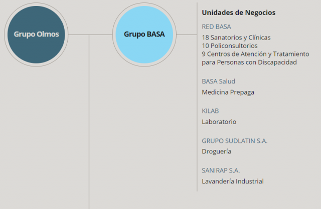 En el sector salud, además de las 18 clínicas mencionadas, el grupo opera 10 policonsultorios y 9 centros de atención y tratamiento para personas con discapacidad. Además es dueño de la prepaga Basa Salud, el laboratorio farmacéutico Kilab, la droguería Sudlatin y la lavandería industrial Sanirap.