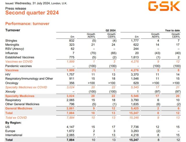 Reconvertida en una compañía biofarmacéutica luego del concretado spin-off de su negocio de OTC que en 2022 dio origen a Haleon, la británica GSK presentó sus resultados financieros correspondientes al primer semestre de 2024. En ellos reportó que sus ingresos medidos en moneda constante ascendieron un 12% a £15.247 millones. Ver Press Release