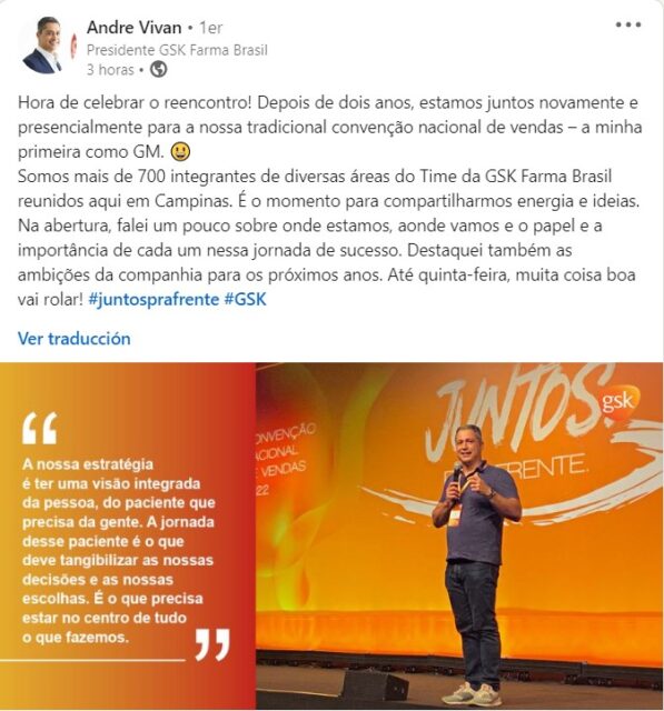 André Vivan tuvo su primera convención nacional de ventas como gerente general de GSK en Brasil. El ejecutivo fue designado como número uno para ese mercado en julio del año pasado, en reemplazo de José Felner. Ver GSK: nuevo presidente para Brasil.