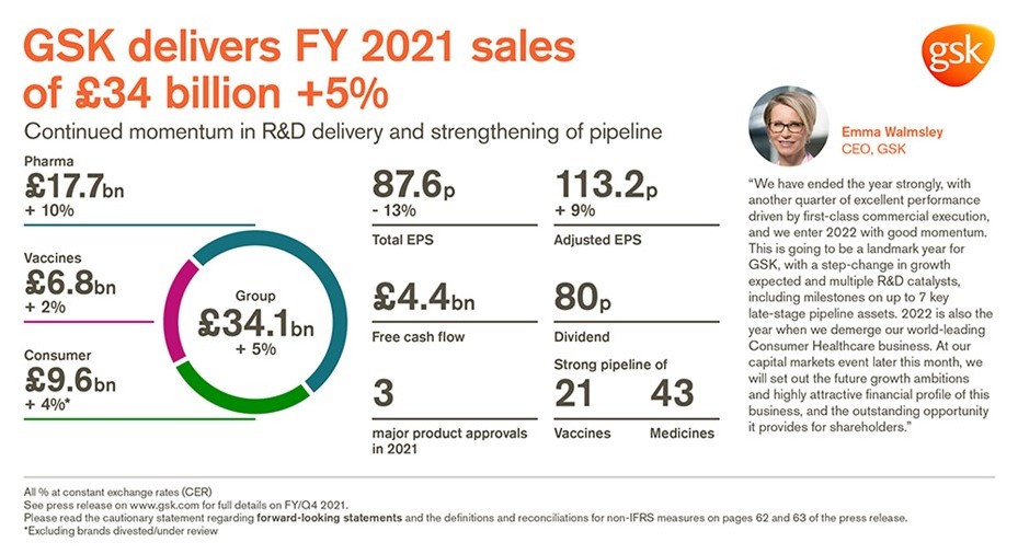 La británica GSK le puso fichas a su división de Farma. En ese marco, en el 2021 registró ventas globales por £ 34.114 millones, lo que representó una suba del 5% frente al 2020. En tanto, durante este 2022 la multi completará la separación de su negocio de Consumer Healthcare en todo el mundo.
