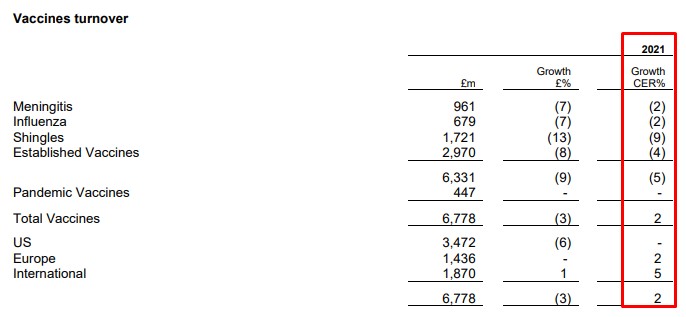 El negocio de Vacunas exhibió ingresos por £ 6.778 millones lo que significó una suba del 2%. Este desempeño estuvo impulsado principalmente por las ventas de adyuvantes pandémicos aunque parcialmente opacado por una menor demanda de las vacunas de rutina para adultos. Por caso, Shingrix, para herpes zóster, cayó un -9%; y sus cartera de Vacunas Establecidas descendió un -4%. En tanto, las vacunas pediátricas como las de meningitis –Bexsero y Menveoreflejaron una baja del -2%.