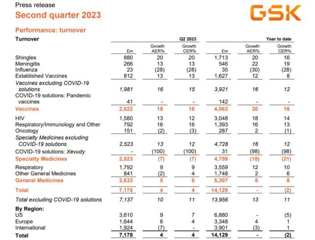 Reconvertida en una compañía biofarmacéutica luego del concretado spin-off de su negocio de OTC que en 2022 dio origen a Haleon, la británica GSK presentó sus resultados financieros correspondientes al primer semestre de 2023. En ellos reportó que sus ingresos medidos en moneda constante descendieron un –2% a £14.129 millones. Ver Press Release