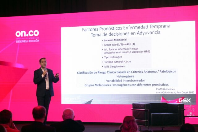 A su turno, Gonzalo Gómez Abuin, jefe de la Unidad de Investigación de Oncología en el Hospital Alemán puso su mirada sobre el rol de la inmunoterapia en cáncer de endometrio y los resultados del estudio GARNET, mediante el que se aprobó Jemperli.