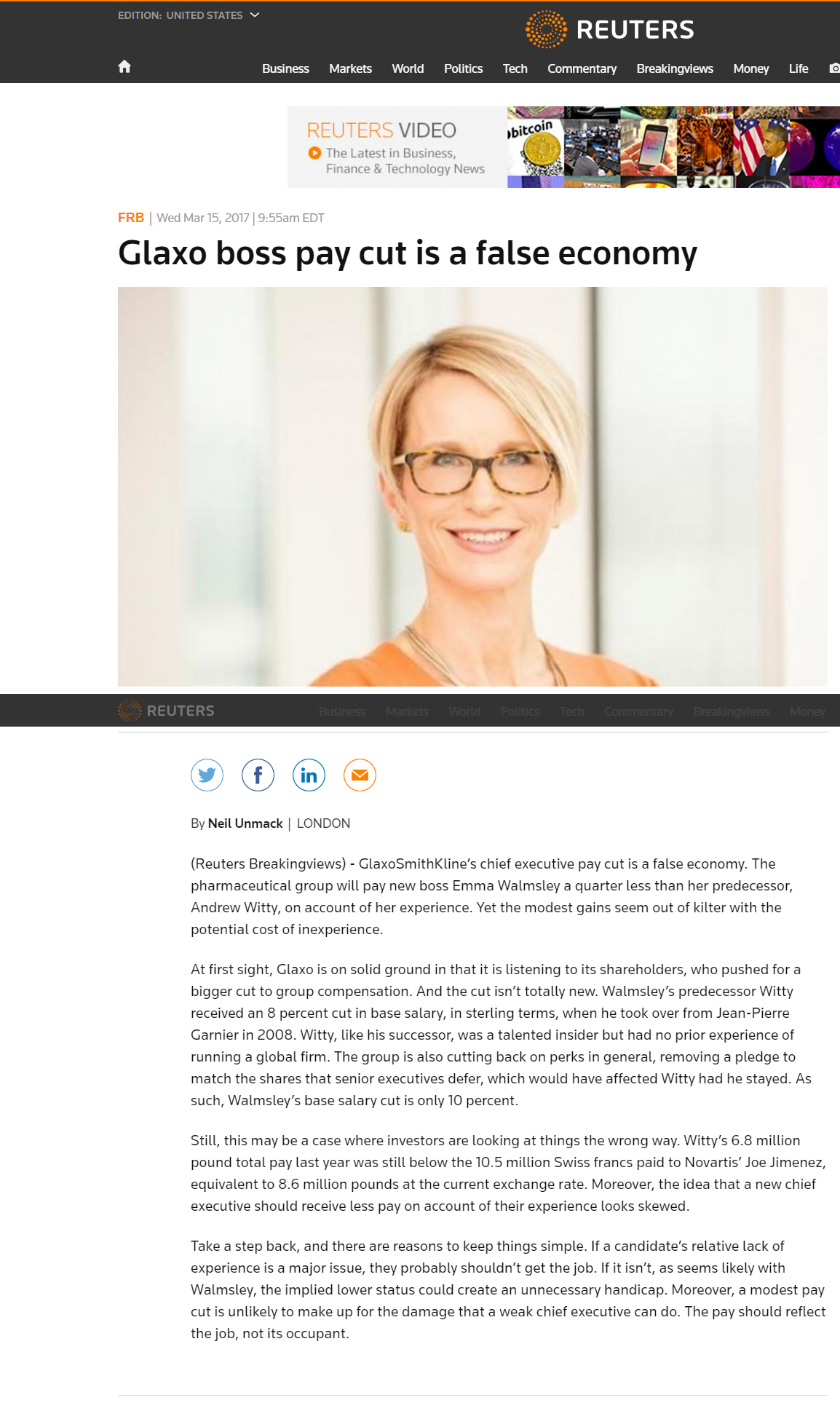 Hoy, 1 de abril del 2017, asume una CEO mujer al frente del laboratorio británico GSK. La noticia es positiva, aunque ganará un cuarto menos de lo que ganaba su antecesor hombre.