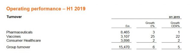 La división que mostró su mejor cara fue la de Vacunas, que escaló un 22% frente al mismo período del año anterior, y que facturó £ 3.107 millones impulsada por un fuerte desempeño de su vacuna contra el herpes Shingrix, que trepó más del 100%. Le siguió Consumo Masivo, que registró ingresos por £ 3.898 millones, con un alza del 2% en respecto del primer semestre del 2018.