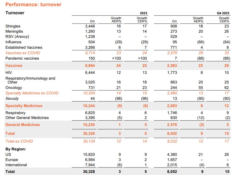 El negocio de Vacunas fue el que se puso a la cabeza con un alza interanual del 25%, medida en moneda constante, y una facturación de £ 9.864 millones. Este desempeño estuvo principalmente empujado por Shingrix, para herpes zóster, que escaló un 17% en el 2023, y en segundo término por las vacunas pediátricas para meningitis, Bexsero y Menveo, que contribuyeron a los resultados con un incremento del 14%. La citada Arexvy, que no tiene base de comparación por haber sido lanzada en 2023, aportó ingresos por £ 1.238 millones en menos de un año. Por su parte, Vacunas Establecidas creció un 7% y el segmento para Pandemia más del 100%. En cambio, Influenza retrocedió un -4%.
