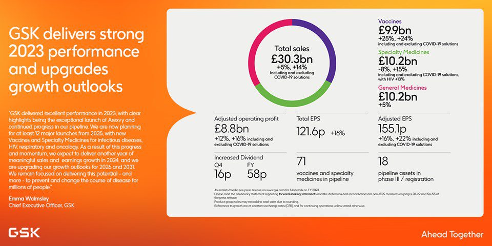 “GSK obtuvo una excelente performance en 2023, destacando claramente el lanzamiento excepcional de Arexvy y el progreso continuo en nuestra cartera”, dijo su CEO Emma Walmsley. “Ahora estamos planificando al menos 12 lanzamientos importantes a partir de 2025, con nuevas vacunas y medicamentos especializados para enfermedades infecciosas, VIH, respiratorias y oncológicas. Como resultado de este progreso e impulso, esperamos lograr otro año de crecimiento significativo de ventas y ganancias en 2024, y estamos mejorando nuestras perspectivas de crecimiento para 2026 y 2031”, destacó.