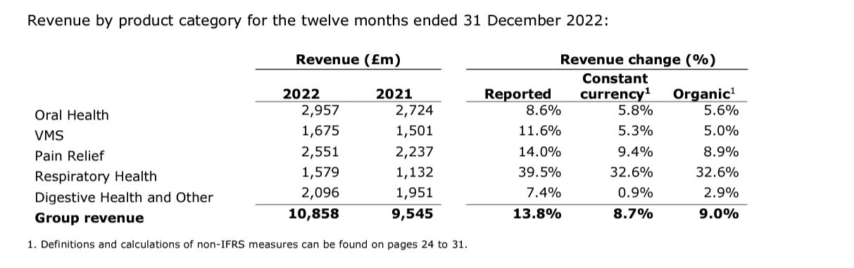 En ellos reportó que su negocio de Salud Oral, que por caso incluye a marcas como Sensodyne; Aquafresh; Parodontax y Corega; subió 8,6% a £2.957 millones; mientras que su cartera de VMS, que incluye a Centrum y Emergen-C, ascendió 11,6% a £1.675 millones. Ver Presentación.