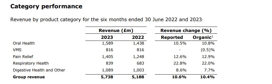 En ellos reportó que su negocio de Salud Oral, que por caso incluye a marcas como Sensodyne; Aquafresh; Parodontax y Corega; subió 10,5% a £1.589 millones; mientras que su cartera de VMS, que incluye a Centrum y Emergen-C, se mantuvo sin cambios en £816 millones. Ver Presentación.