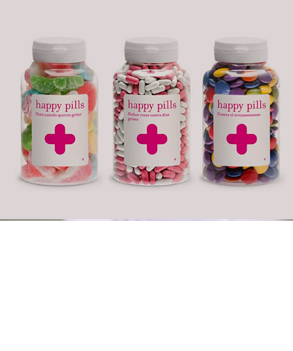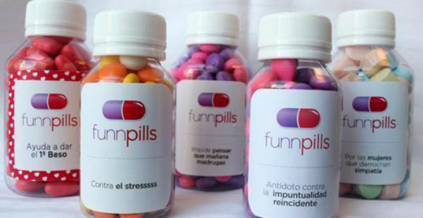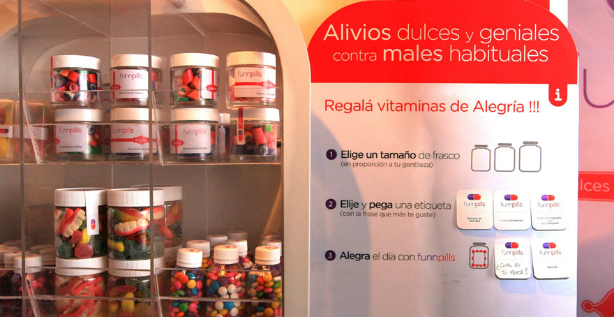FunnPills también sigue esta nueva moda y tiene sus productos distribuidos en una gran cantidad de tiendas a lo largo de la Argentina. Los frascos de golosinas, indican su composición pero de una forma más divertida, llenos de sonrisas, chistes, carcajadas y cosquillas. Ver sitio.