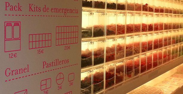 Allí todo apela al lenguaje farmacéutico, las golosinas se venden en novedosos envases de diseño, kits de emergencia que simulan ser un botiquín y pastilleros.