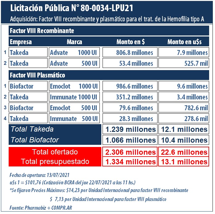 En este 2021 y según el desglose realizado por el equipo de analistas de Pharmabiz, la japonesa Takeda -que había sido la única ganadora de la última licitación del 2019- es la candidata más fuerte para volver a ganar en esta licitación. La multi se postuló a fin de cubrir la entrega de 63.9 millones de unidades de Advate -factor VIII recombinante-; y 59.6 millones de unidades de Immunate -factor VIII plasmático-. Todo por una suma de $1.239 millones (u$s 12.1 millones), y precios unitarios entre un 5.48% y un 10.8% más bajos que los montos tope definidos desde el Estado. Ambas marcas son de industria austríaca y fabricadas por la norteamericana Baxter. Ver «Takeda – Shire: se completó deal»