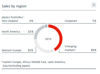 Al analizar sus ventas por regiones, llama la atención el gran protagonismo que tiene la compañía en los mercados emergentes. Dicha región le representa el 42% de sus ventas.
