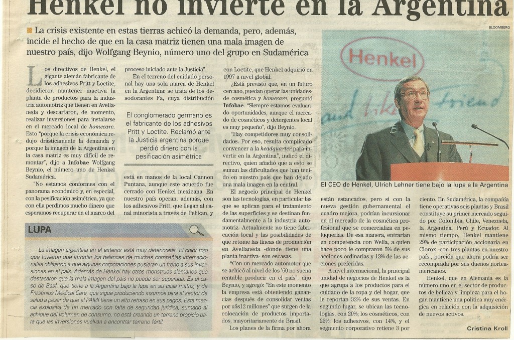 Los directivos de Henkel, el gigante alemán fabricante de los adhesivos Pritt y Loctite, decidieron mantener inactiva la planta de productos para la industria automotriz que tienen en Avellaneda y descartaron, de momento, realizar inversiones para instalarse en el mercado local de homecare. Esto «porque la crisis económica redujo drásticamente la demanda y porque la imagen de la Argentina en la casa matriz es muy difícil de remontar«, dijo a Infobae Wolfgang Beynio, el número uno de Henkel Sudamerica.