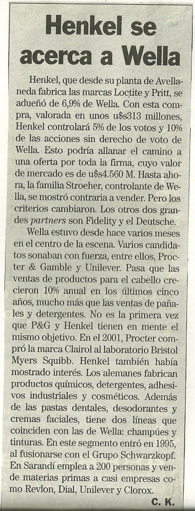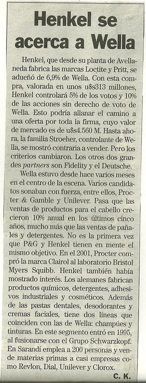 Wella estuvo desde hace varios meses en el centro de la escena. Varios candidatos sonaban con fuerza, entre ellos, Procter & Gamble y Unilever. Pasa que las ventas de productos para el cabello crecieron 10% anual en los últimos cinco años, mucho más que las ventas de pañales y detergentes. No es la primera vez que P&G y Henkel tienen en mente el mismo objetivo. En el 2001, Procter compró la marca Clairol al laboratorio Bristol Myers Squibb. Henkel también había mostrado interés. Los alemanes fabrican productos químicos, detergentes, adhesivos industriales y cosméticos. Además de las pastas dentales, desodorantes y cremas faciales, tiene dos líneas que coinciden con las de Wella: champúes y tinturas. En este segmento entró en 1995, al fusionarse con el Grupo Schwarzkopf. En Sarandí emplea a 200 personas y vende materias primas a casi empresas como Revlon, Dial, Unilever y Clorox.