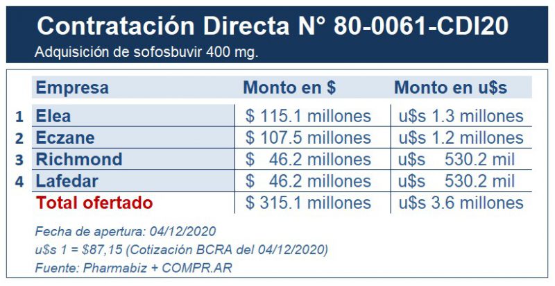 Cada unidad de sus productos Probirase y Hepagris a base de sofosbuvir fueron cotizadas en $1.040 (u$s 11.8), y de resultar elegidas podrían facturar una suma de $46.2 millones (u$s 530.2 mil) por la entrega parcial de 44.436 unidades.