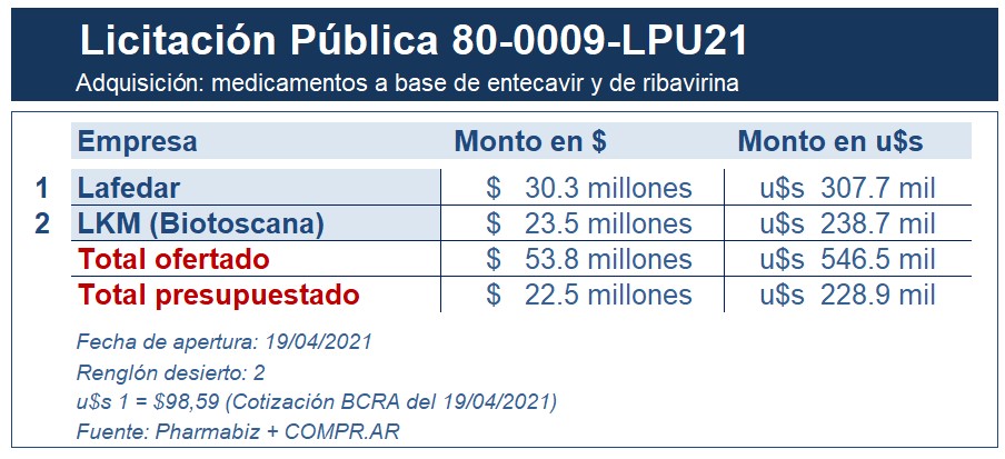 El proceso licitatorio para el que el Estado tiene previsto destinar un presupuesto estimado de $22.5 millones (u$s 228.9 mil), está centrado específicamente en la compra de medicamentos a base de entecavir y de ribavirina. Aunque el renglón correspondiente a esta última opción quedó desierto en función de que no se presentaron oferentes.