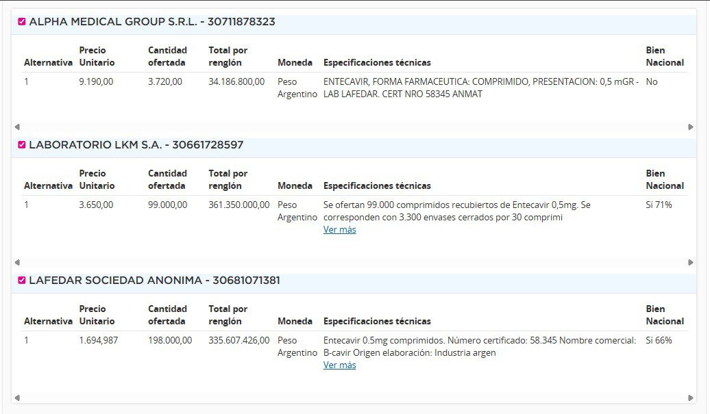 Y tras el llamado se supo que tres empresas se presentaron a esta compulsa. Por un lado está la canadiense Knight Therapeutics, que se anotó con su marca Teneir. El laboratorio se registró con un precio unitario de $3.650 (u$s 2,50), lo que se traduce en una suma de $361.4 millones (u$s 247.6 mil). En segundo lugar, figura el entrerriano Lafedar, con su marca B-cavir. La compañía cotizó cada unidad a $1.694,98 (u$s 1,61), lo que representa un monto total de $335.6 millones (u$s 229.9 mil). En tercer lugar, surge Alpha Medical Group que se presentó con el producto del nacional Lafedar, a un precio unitario de $9.190 (u$s 6,29), totalizando una suma de $34.2 millones (u$s 23.4 mil). Ver Cuadro Comparativo