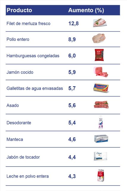 En la canasta general, en tanto, los productos que más aumentaron fueron el filet de merluza fresco, con una suba a dos dígitos, por un total de 12,8%; el pollo entero, cuya suba fue del 8,9%; y las hamburguesas congeladas, que completaron el tercer lugar con un 6%. Asimismo, le siguió el jamón cocido, con el 5,9%, y luego figuran las galletitas de agua envasadas, que se retocaron un 5,7%. Por su parte, el desodorante quedó séptimo y el jabón de tocador, noveno.