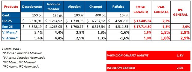 En ese mes, la compra de este quinteto de productos implicó un desembolso de $17.714,80 (u$s 12,25), mientras que en diciembre de 2025 la canasta de higiene tuvo un precio total de $17.405,84 (u$s 11,72*).