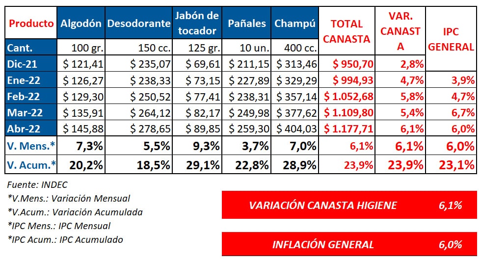 En conjunto, todos los artículos de aseo medidos por el INDEC marcaron una suba del 23,9% de enero a abril del 2022. Esto incluye, a su vez, al desodorante que registró un incremento del 5.5%; y a los pañales, que se remarcaron un 3.7% en el cuarto mes del año.