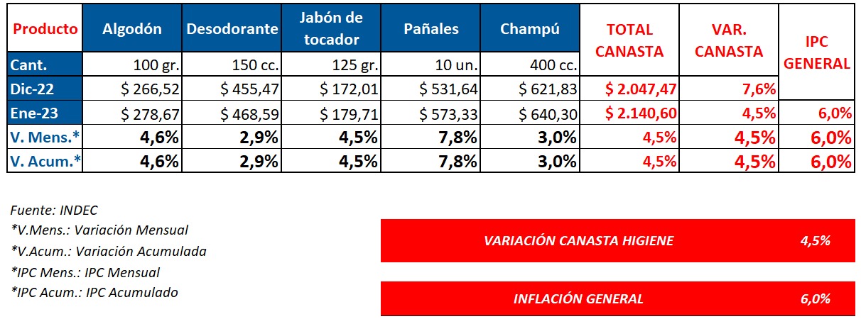 A la su vez, en este primer mes del año, adquirir la canasta de higiene configurada por el INDEC implicó un desembolso de $2.140,60 (u$s 10,75). En tanto, en diciembre pasado, suponía una inversión del $2.047,47 (u$s 10,88*). Cabe aclarar que en el 2022, la inflación de la canasta de higiene trepó por encima del IPC con un incremento del 115,4%. Ver artículo.