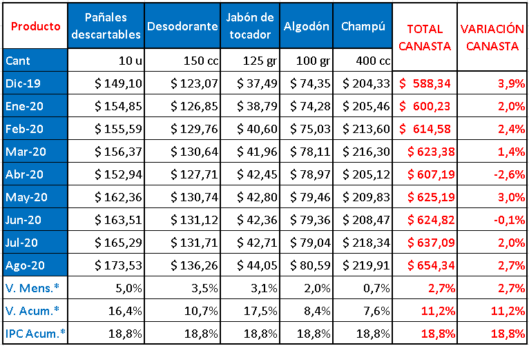 En agosto, y según el organismo, la variación de esta canasta fue del 2.7%, igual que la del IPC. Y en paralelo, la inflación general hasta el octavo mes del año fue del 18.8%, mientras que el aumento acumulado de la canasta de higiene en el mismo período fue de un 11.2%. Ver artículo. Ver informe.
