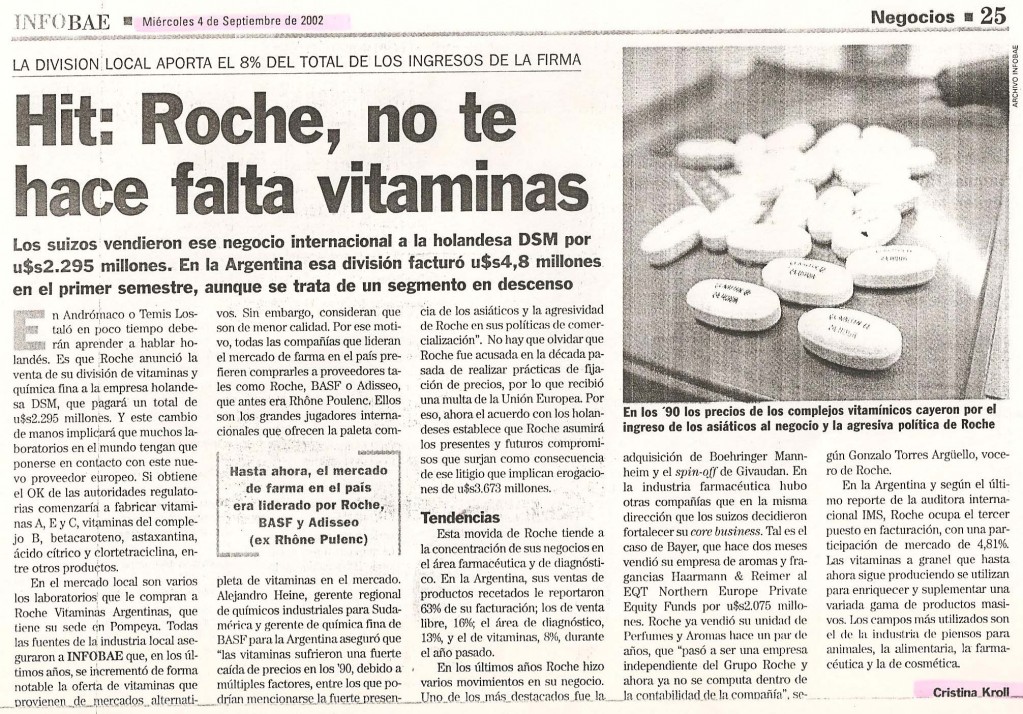 En el mercado local son varios los laboratorios que le compran a Roche Vitaminas Argentinas, que tiene su sede en Pompeya. Todas las fuentes de la industria local aseguraron a Infobae que, en los últimos años, se incrementó de forma notable la oferta de vitaminas que provienen de mercados alternativos. Sin embargo, consideran que son de menor calidad. Por ese motivo, todas las compañías que lideran el mercado de farma en el país prefieren comprarles a proveedores tales como Roche, BASF o Adisseo, que antes era Rhone Poulenc. Ellos son los grandes jugadores internacionales que ofrecen la paleta completa de vitaminas en el mercado. Alejando Heine, gerente regional de químicos industriales para Sudamérica y gerente de química fina de BASF para la Argentina aseguró que “las vitaminas sufrieron una fuerte caída de precios en los ´90, debido a múltiples factores, entre los que podrían mencionarse la fuerte presencia de los asiáticos y la agresividad de Roche en sus políticas de comercialización”. No hay que olvidar que Roche fue acusada en la década pasada de realizar prácticas de fijación de precios, por lo que recibió una multa de la Unión Europea. Por eso, ahora el acuerdo con los holandeses establece que Roche asumirá los presentes y futuros compromisos que surjan como consecuencia de ese litigio que implican erogaciones de u$s3.673 millones. Hasta ahora, el mercado de farma en el país era liderado por Roche, BASF Y Adisseo -ex Rhone Pulenc-.