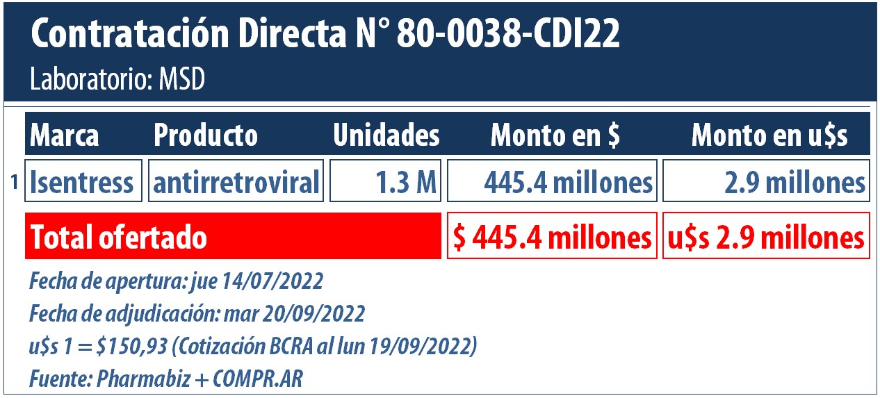 La norteamericana MSD resultó adjudicataria de una Contratación Directa por Exclusividad. Es para la provisión de 1.3 millones de unidades de Isentress, para HIV, por el que el Estado desembolsará $445.4 millones (u$s 2.9 millones).