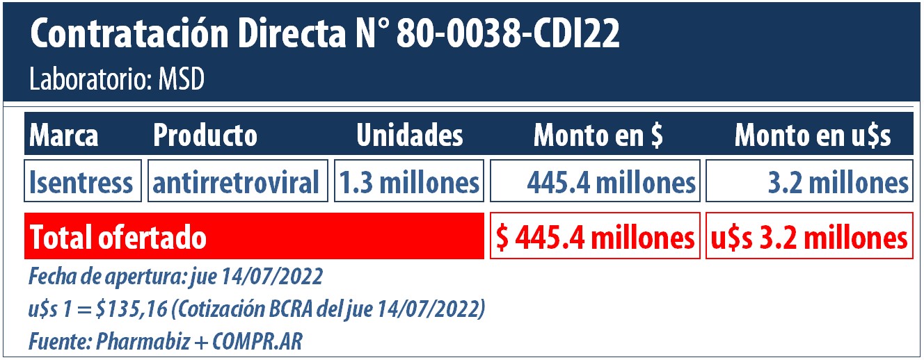 En agosto del 2021, el Estado emitió la Orden de Compra a fin de adquirir 63 mil unidades de Isentress 100 mg. por $13.7 millones (u$s 133.7 mil*). La misma se efectuó en el marco de una Contratación Directa que el Ministerio de Salud de la Nación había puesto en marcha durante el mes de junio del 2021. Ver artículo