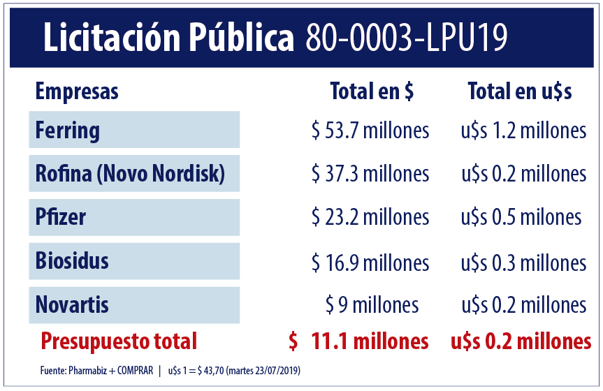 De acuerdo al desglose realizado por el equipo de analistas de Pharmabiz, se identificó que el principal oferente es la suiza Ferring que se presentó en ambos renglones con su producto Zomacton por un total de $53.7 millones (u$s 1.2 millones). Ver licitación.