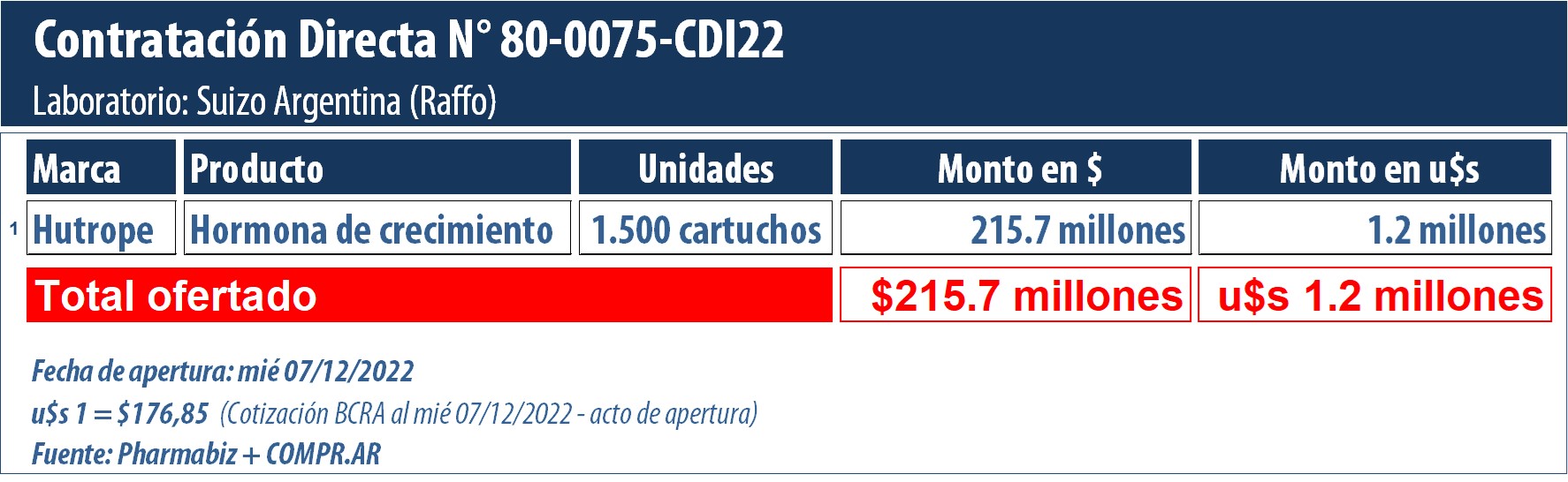 La nueva contratación implica la provisión de 1.500 cartuchos de este producto a base de somatotropina ADN recombinante. Se trata de una marca propiedad de la norteamericana Eli Lilly y que quedó bajo el paraguas de los nacionales de Raffo luego de que la multi cerrara su filial en la Argentina. El proceso, que se puso en marcha bajo la modalidad de «orden de compra abierta«, ahora tiene como contraparte a la droguería Suizo Argentina e incluye el pertinente servicio de logística. La empresa propiedad de la familia Kovalivker ofertó un monto total de $215.7 millones (u$s 1.2 millones) y un precio de $143.817 (u$s 813,21) por cartucho. Ver Contratación / Ver Cuadro Comparativo
