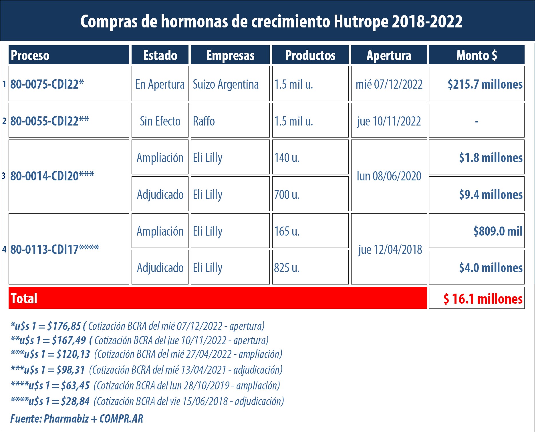 La hormona de crecimiento Hutrope, la que lleva el sello de la estadounidense Eli Lilly y se encuentra bajo el paraguas del nacional Raffo en la Argentina, volvió al COMPR.AR. La droguería Suizo Argentina podría facturar $215.7 millones (u$s 1.2 millones) por la provisión de 1.500 cartuchos.