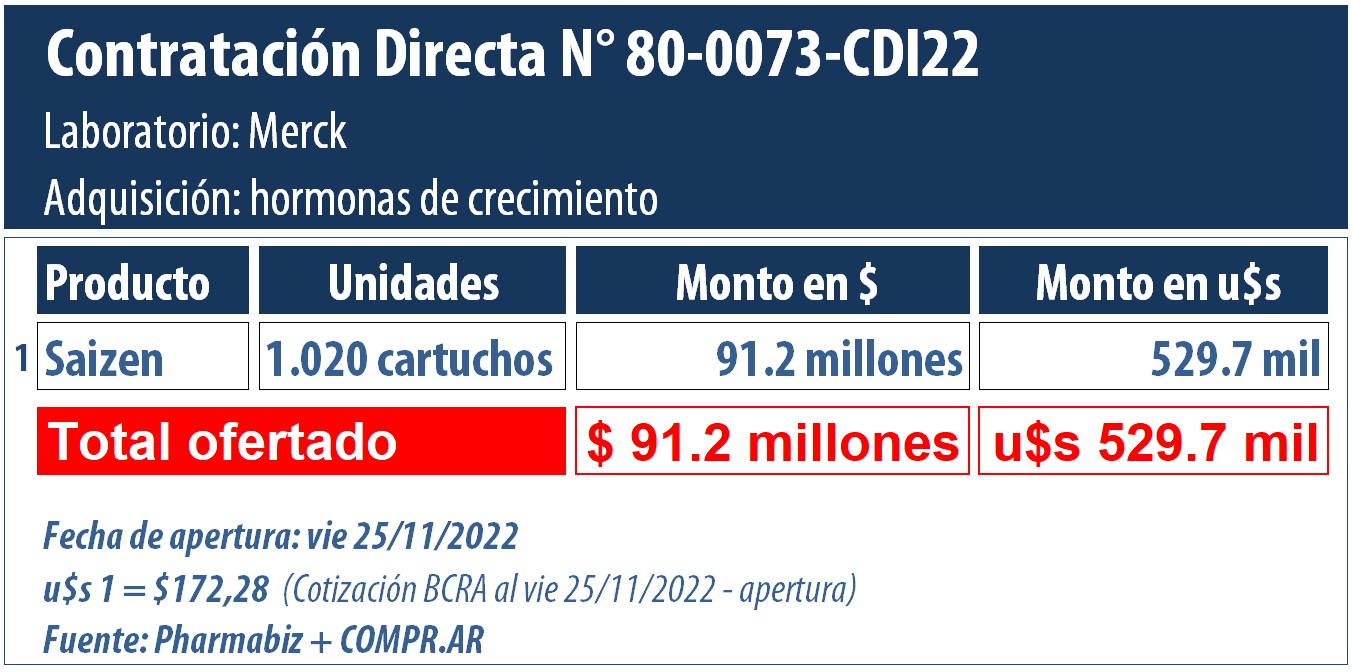 La alemana Merck está en carrera a fin de proveerle al Estado de 1.020 cartuchos prellenados de su hormona recombinante humana Saizen. Todo por un monto de $91.2 millones (u$s 529.7 mil) y en el marco de una Contratación Directa por Exclusividad que había quedado desierta el pasado 11 de noviembre.