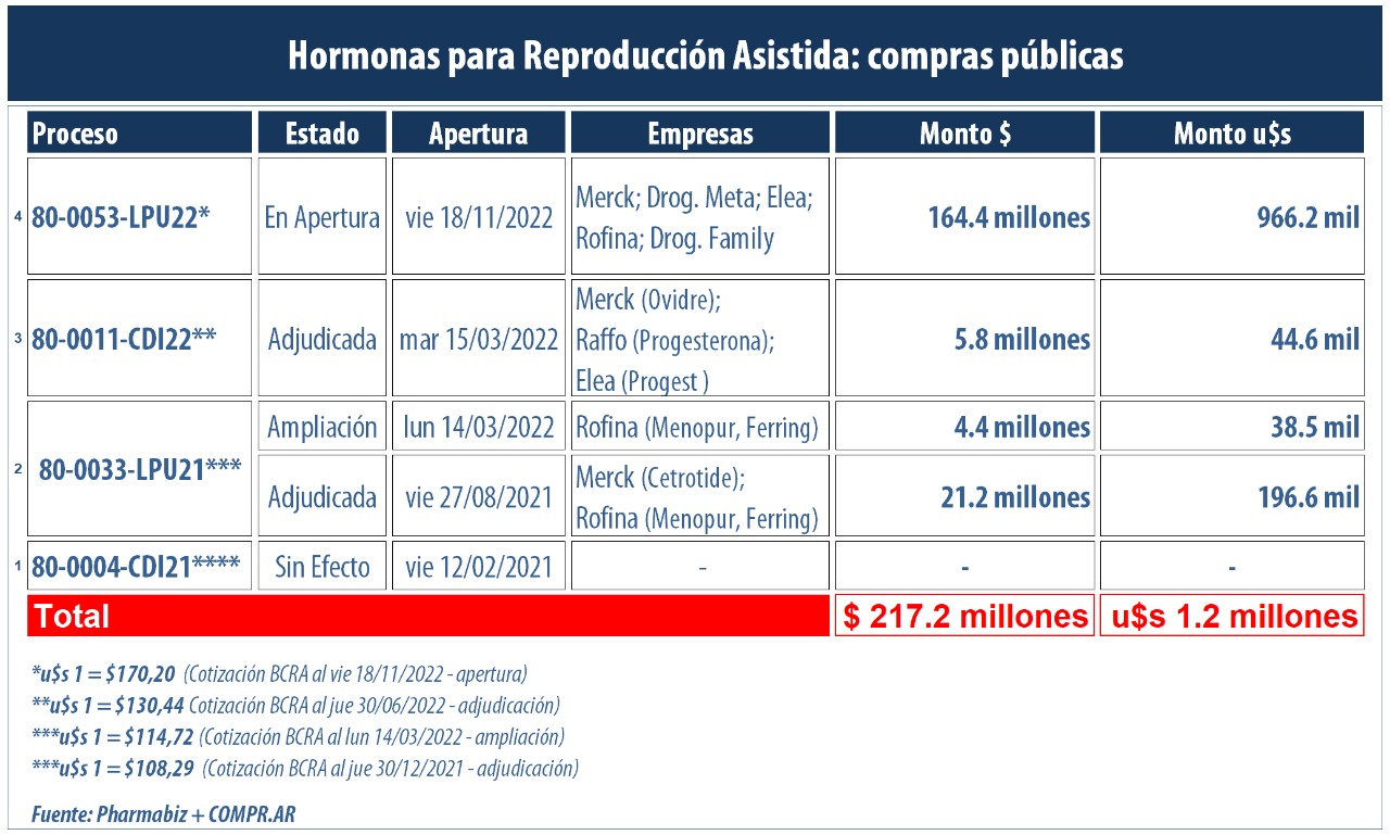 El proceso que fue solicitado por la Dirección de Salud Perinatal y Niñez, apunta específicamente a la compra de siete tipos de hormonas, para las que se definió en conjunto un presupuesto estimado de $103.9 millones (u$s 610.9 mil). Figuran: 1.500 frascos ampolla de gonadotrofina coriónica humana -liofilizado por 5 mil Unidades Internacionales-; 1.500 cartuchos prellenados de coriogonadotropina alfa; 4.800 ampollas a base de menotropina altamente purificada 75 UI.; 2.400 soluciones inyectables que combinan folitropina alfa y lutropina alfa; 753 cajas de 30 comprimidos cada una compuestos por progesterona 200 mg.; y 11 mil unidades de comprimidos de citrato de clomífero 50 mg.; y 800 ampollas de hormonas medicinales a base de cetrorelix 0,25 mg. Ver pliego