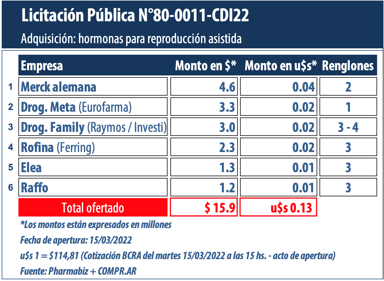 Según el desglose realizado por el equipo de analistas de Pharmabiz, seis empresas se presentaron a esta compulsa. La primera que se lista, en términos de facturación, es la alemana Merck. La multi, que tiene como gerente general a María Sol Quibel en la Argentina, fue la única que cotizó a fin de cubrir la entrega de 900 unidades de Ovidrel, su hormona a base de coriogonadotropina alfa. Todo por una suma de $4.6 millones (u$s 40.8 mil). Ver Cuadro Comparativo.