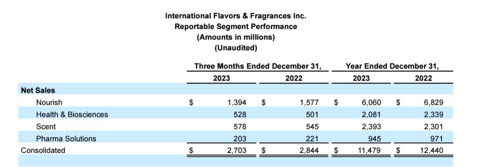 La facturación de la estadounidense International Flavours & Fragrances declinó un -8% durante su año fiscal 2023 al totalizar u$s 11.479 M. Para el ejercicio en curso la compañía que, desde este mes tiene a Erik Fyrwald como nuevo CEO, espera ingresos en el rango de los u$s 10.800 y 11.100 M.
