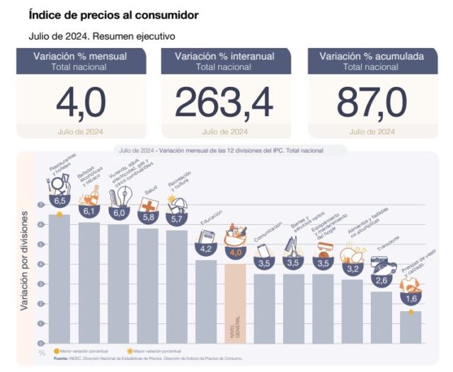 Según el organismo, el acumulado anual llegó al 87,0% y el alza interanual se disparó al 263,4%. Ver informe