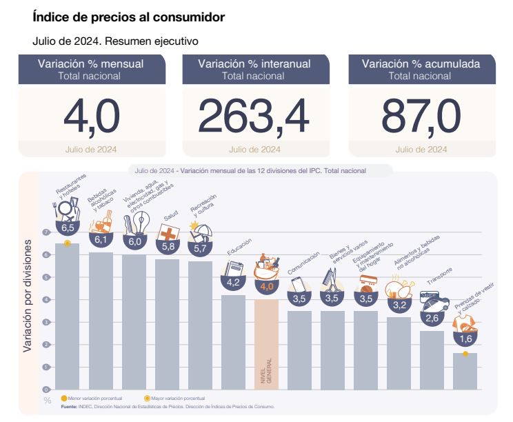 La inflación se encuentra en proceso de desaceleración, a pesar de que todavía se ubica entre las más altas de la región. Según el INDEC, en julio el incremento de precios fue del 4,0% y el acumulado anual ya alcanzó el 87,0%.