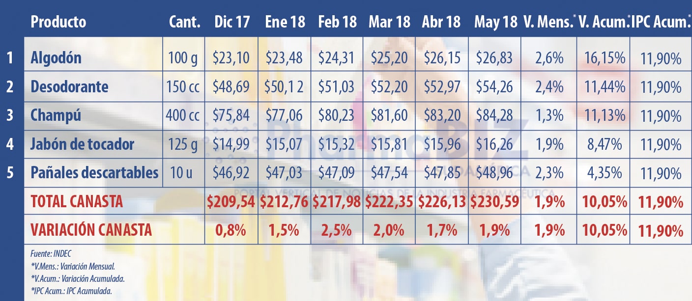 Durante mayo, el INDEC dijo que un paquete de algodón de 100g; un jabón de tocador de 125 gr; un desodorante de 150 cc; un champú de 400 cc; y pañales descartables por 10 unidades costaron $230.59. Durante abril, el mismo grupo de productos cotizaba $226,13. Así, la canasta de higiene relevada por el INDEC registra una suba del 1.9% al comparar mes contra mes.